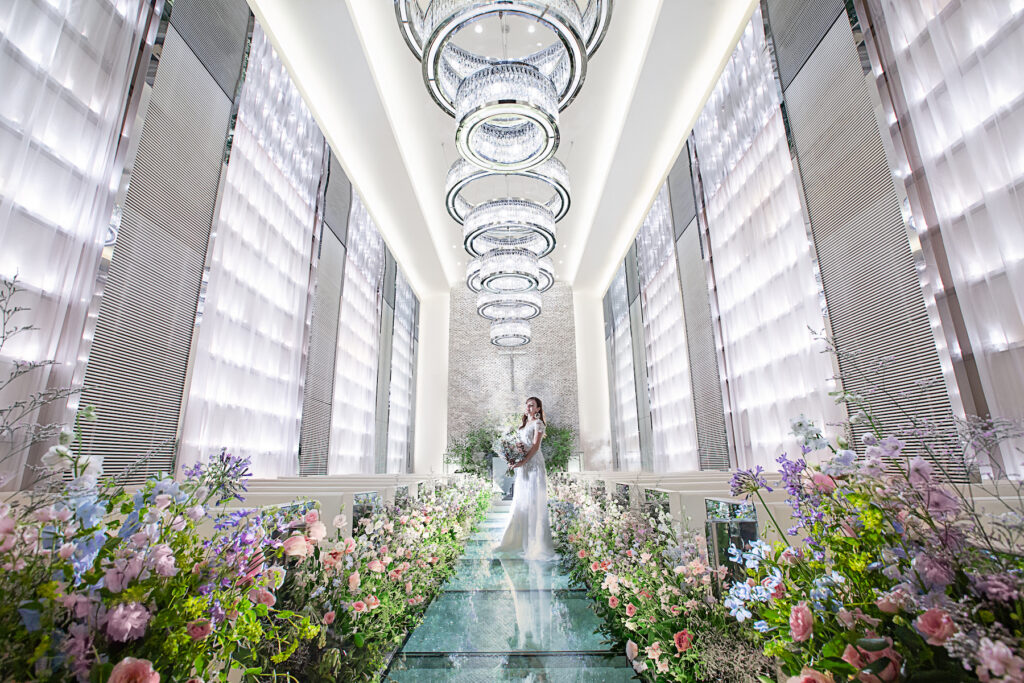 まるで鏡のようにおふたりを幻想的に映し出すガラスのバージンロード