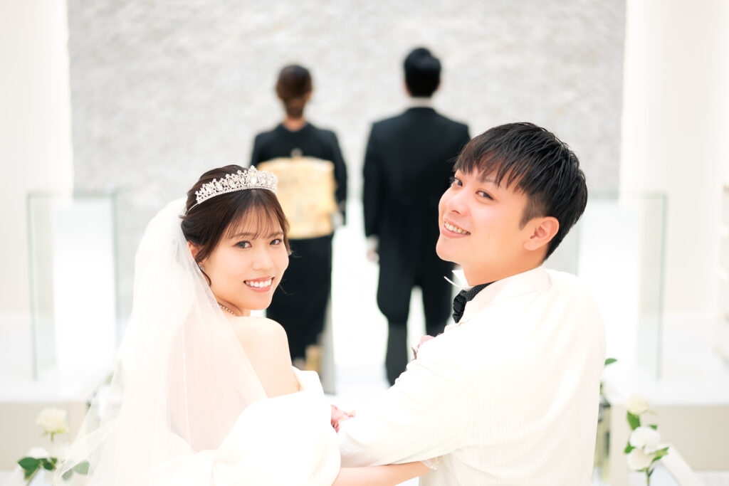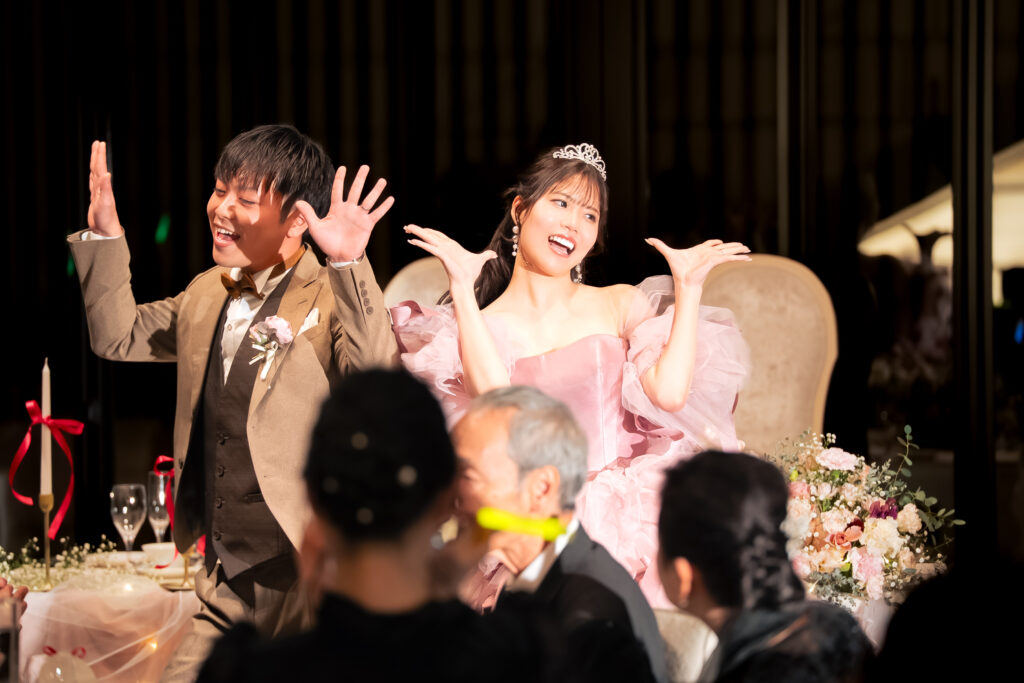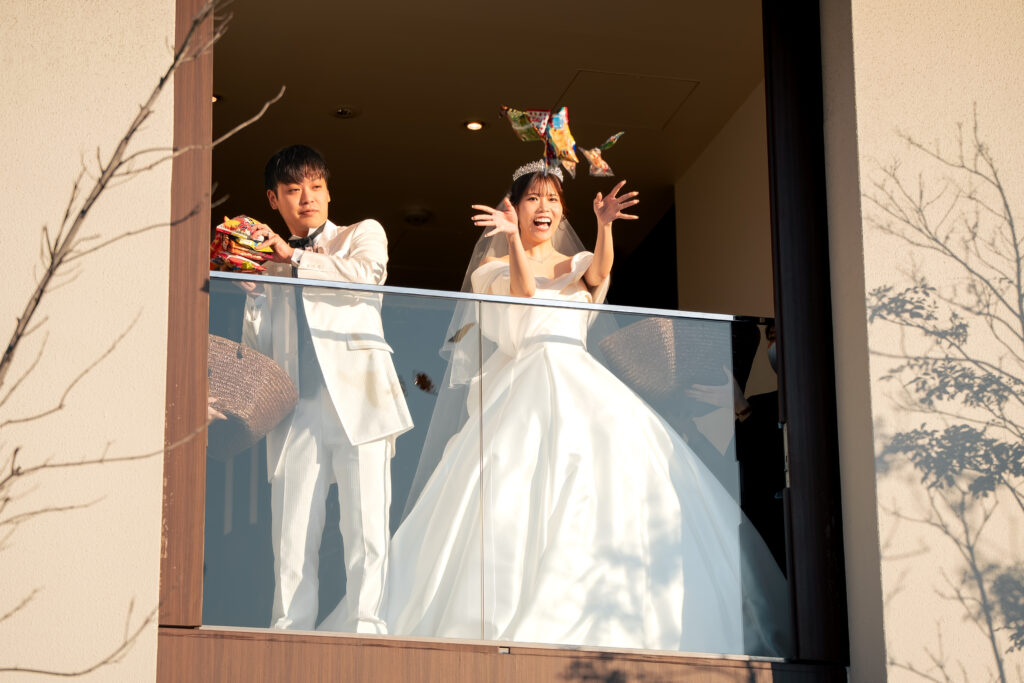 挙式後には、名古屋名物「お菓子まき」やお色直し後には、ふたりで踊ったり♪